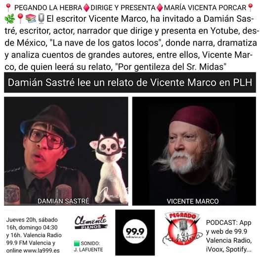 Escucha el cuento Por gentileza del señor Midas (Incluido en la recopilación El desorden de los números cardinales) interpretado desde México por Damián Sastré (La nave de los gatos locos)https://www.youtube.com/@DamianSastrepresenta y en el programa de María Vicenta Porcar (Pegando la hebra) https://la999.es/programas/pegando-la-hebra/vicente-marco-aguilar-hace-de-anfitrion-de-damian-sastre-escritor-actor-y-narrador-mexicano-que-dirige-la-nave-de-los-gatos-locos-en-youtube/?fbclid=IwY2xjawNxREVleHRuA2FlbQIxMQBicmlkETFpMFNOVHl0MTMxVnY3SWt4AR6c1RjIfUgmYXircbQN3wLd69tVmhZzJGj-5khnio3mukQOtnjFRErEP-NFww_aem_LYVolhl6Zgm9lnGNdsOcKw